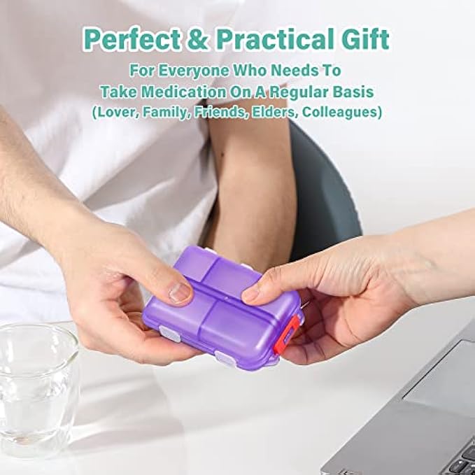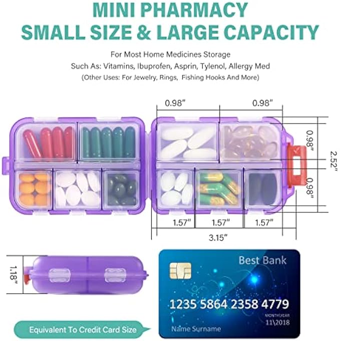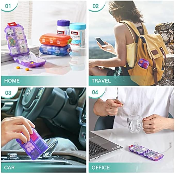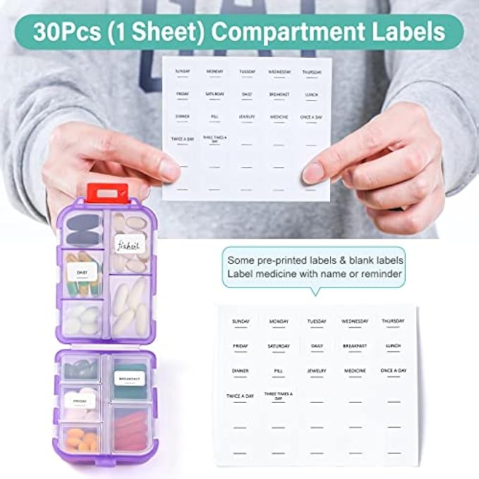 ★Product Includes - 1 pack purple color pill organizer boxes and 30 pcs labels, some are pre-printed and some are blank. The labels match the inner cover's size to help you mark the date, dosage(such as: 2 times a day), medication name, and so on. ★Why You Need Some Pill Organizers? - During your long-distance or family trip, we may need more than a week's worth of pills to meet our daily needs. You can also bring different medicine boxes when you are at home, in the office, or some outdoor activities to avoid confusion. They are also perfect and practical gift for everyone who needs to take medication on a regular basis(your lover, family, friends, elders, colleagues, and so on.) ★Mini Compact but Large Capacity - The mini size makes it very convenient to carry, whether in your wallet, pocket, bag, drawer, car storage box, or other places. Each pill box has 10 compartments, 4 large and 6 small, to accommodate different sizes and quantities of medicines. Be suitable for most common medicines such as Vitamins,Cod Liver Oil,Supplements and Medication (some large medicines may not fit). ★Premium Food-grade Materials - These cute pill boxes are made of high-quality food-grade plastic materials which are durable, odorless, and BPA FREE. The cover is clear, and you can easily distinguish the medicine without opening the cover. The compartments are removable and easy to clean(not dishwasher safe). ★Safe design - The medicine box adopts a double safety buckle design, with an external safety buckle and each compartment inner secure buckle. They are easy to open and close, and the inner lids can be removed as a whole for filling pills or cleaning. The design prevents pills from falling or getting dusted in during daily use.