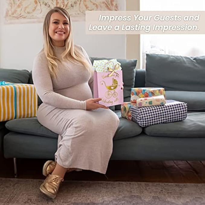 WOW YOUR BABY SHOWER GUESTS WITH UNFORGETTABLE STYLE - Choose from a range of vibrant colors and delight in the mesmerizing design of our baby shower gift bags for girls or for boys, featuring captivating gold foil text embossed on both sides—ensuring your baby shower gift bags for boys or girls make a lasting impression and become the talk of the event among your friends and family!