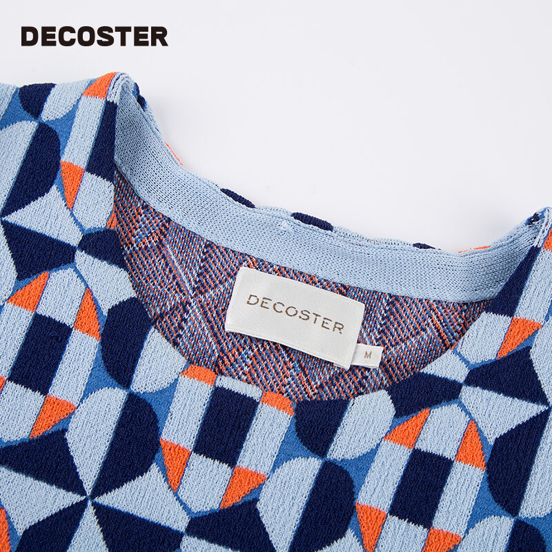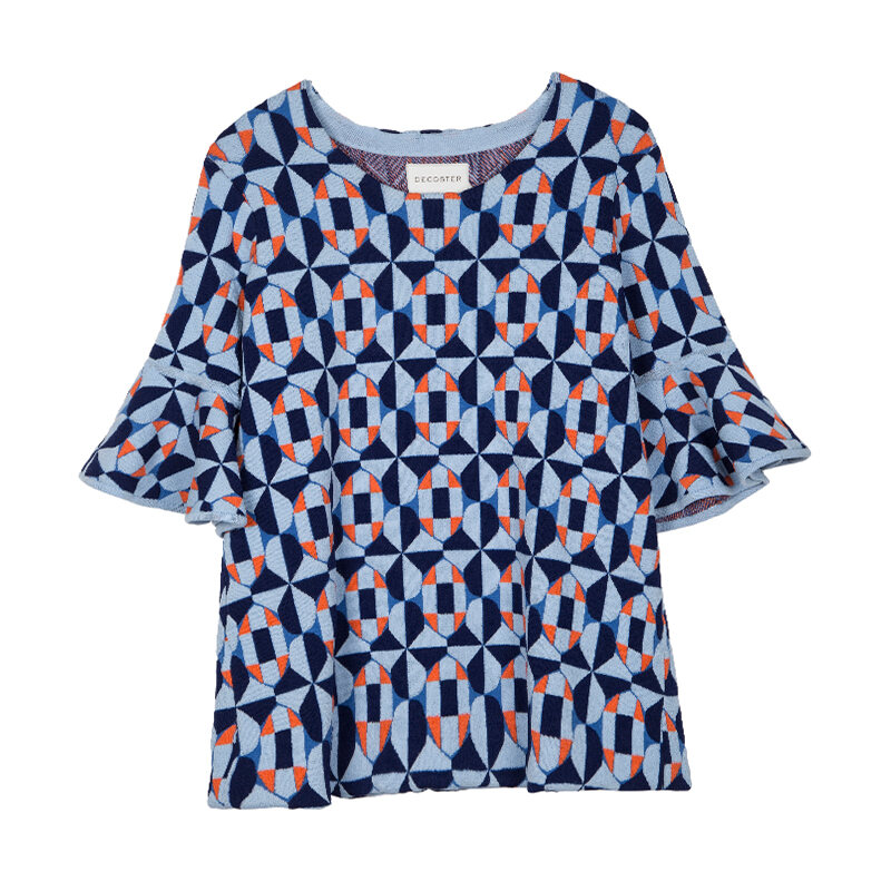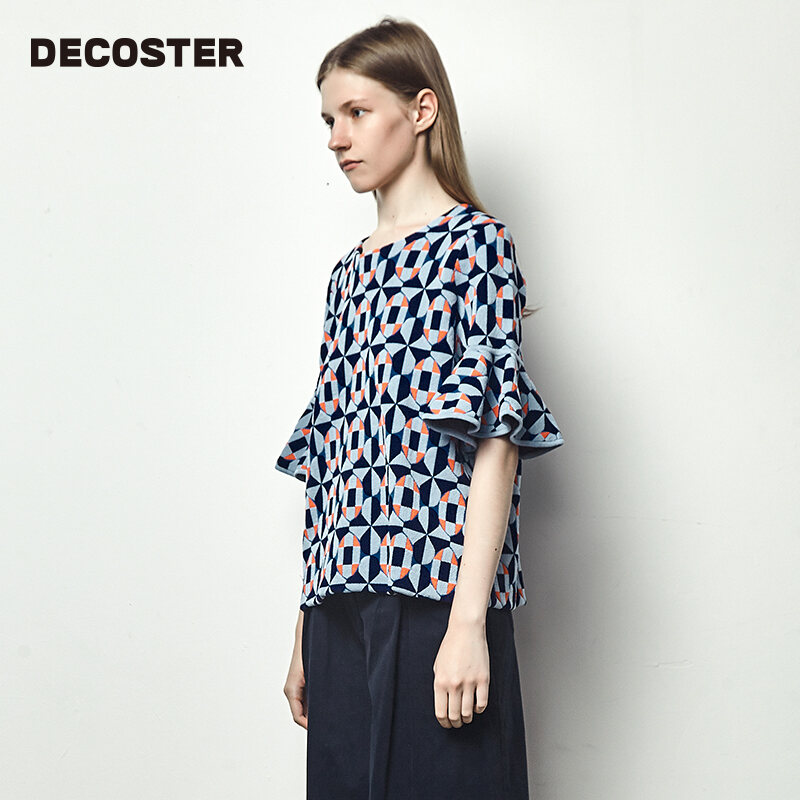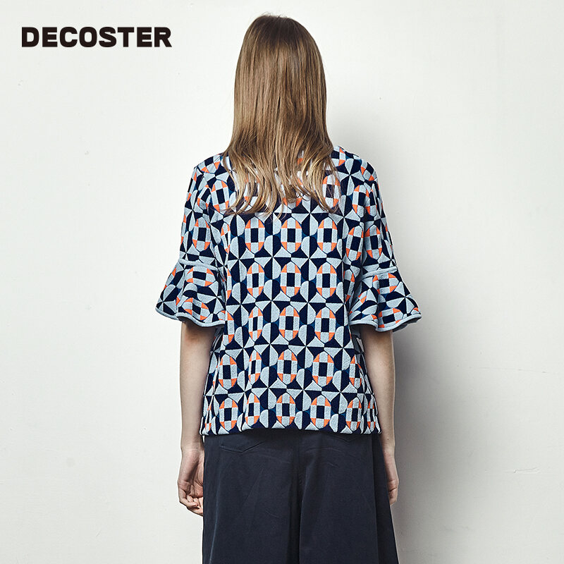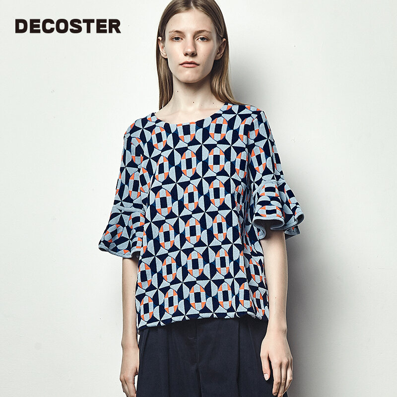 DeCoster Autumn New Brand Women's Clothing Dark Blue Ruffled Half Sleeve Jacquard Knitted Pullover