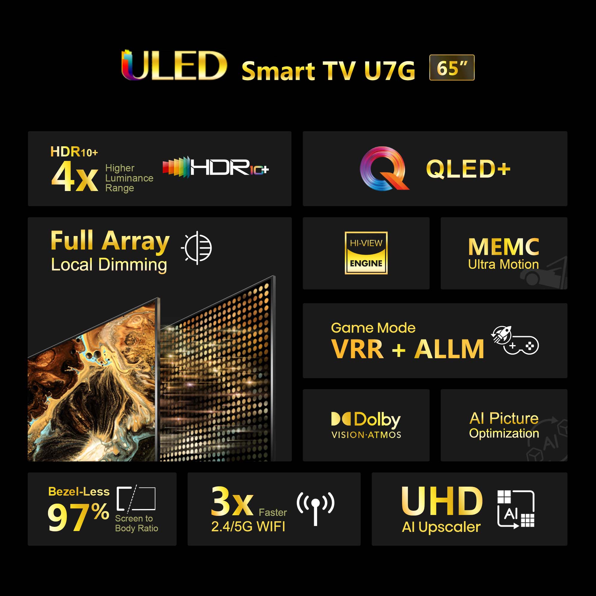 Hisense U7G 65" QLED+/ULED | Full Array Local Dimming | Dolby Vision & Atmos | MEMC | HDR 10+ | VRR ALLM | DTS Virtual X | 4K Smart TV | Peak 700nits Brightness | 178° Wide Viewing Angle | Bluetooth