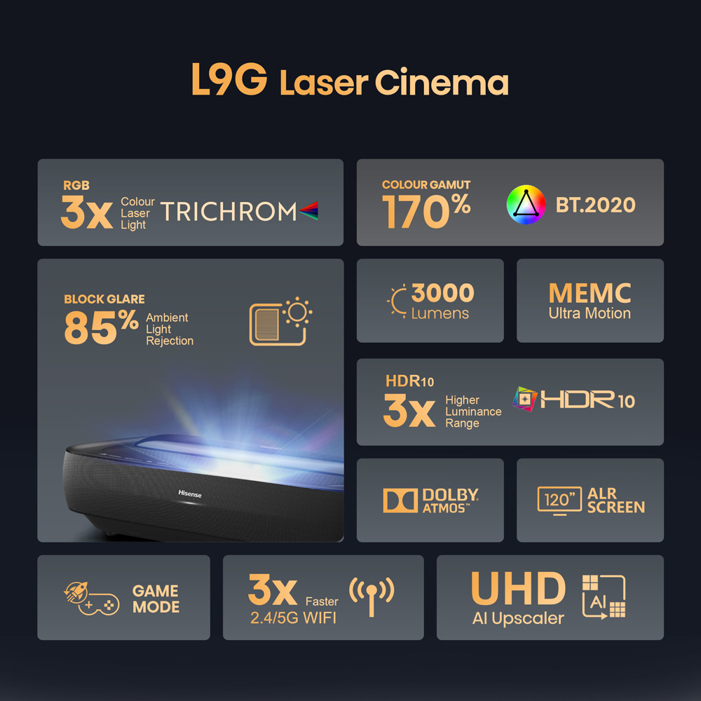 Hisense L9G 100" 120" 4K TriChroma Laser TV Cinema+ ALR screen | 3000 Lumens | BT.2020 107% | MEMC Ultra Motion | HDR 10 | Dolby Atmos | Ambient Light Rejection Screen | 4k Smart TV | Ultra Short Thro