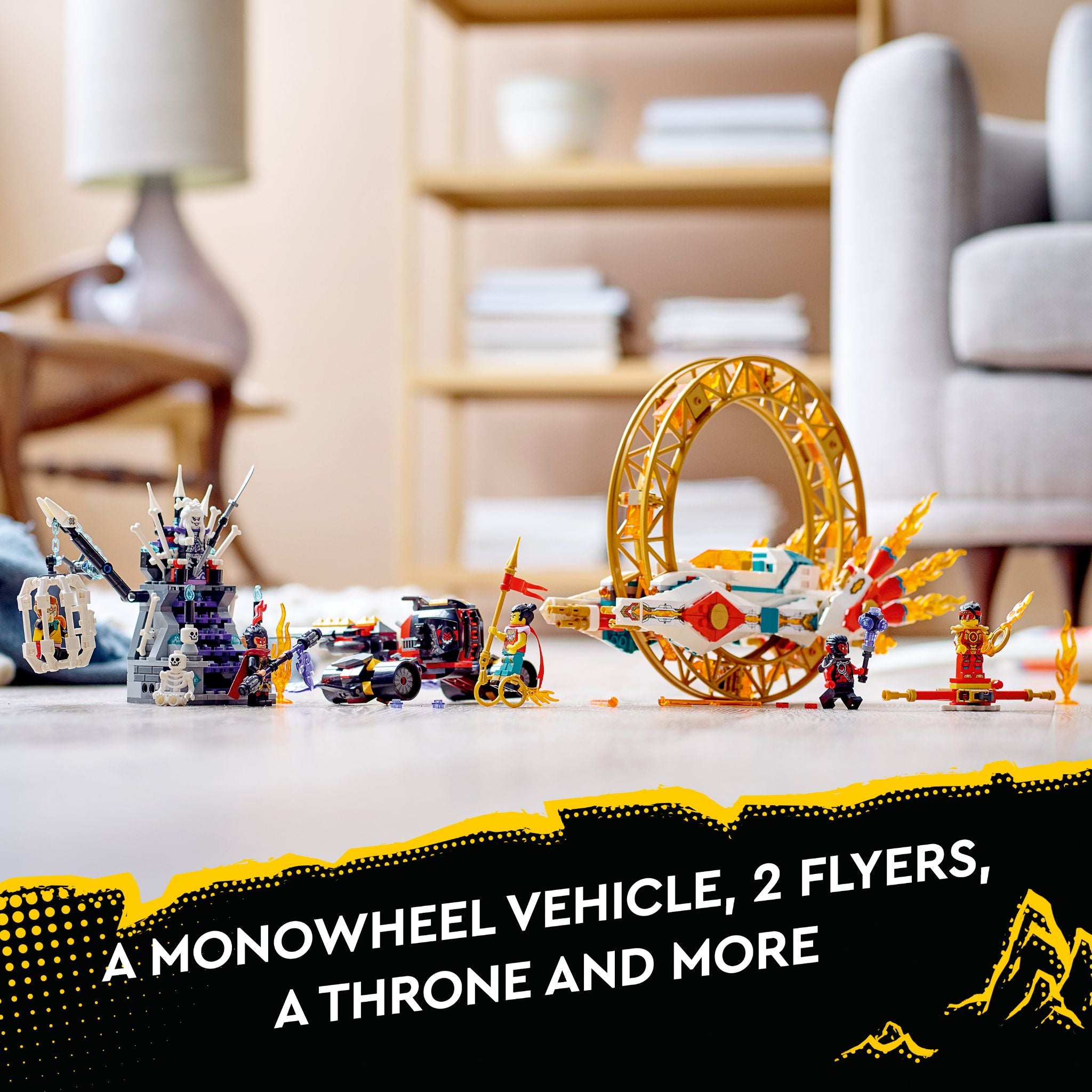 Monkie Kid’s Golden Staff Flyer and White Bone Demon’s throne – The flyer has 2 stud shooters, and the throne has a hanging bone cage to trap Monkey King, plus a cell with a skeleton figure inside