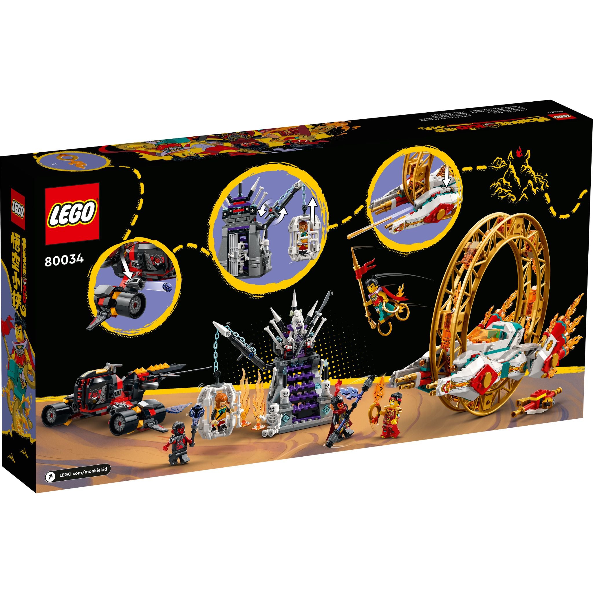 Children can bring legendary characters to life in an exciting new way with this LEGO® Monkie Kid™ battle toy playset (80034). It features Nezha’s Fire Ring monowheel vehicle with 2 flame-energy spring-loaded shooters, the Evil Macaque’s stud-shooting jet flyer, Monkie Kid’s Golden Staff Flyer and the White Bone Demon’s throne with a hanging bone cage and prison cell. There are 6 LEGO minifigures in the set, including Monkie Kid with new-for-January-2022 battle armor decoration, plus toy weapons and accessory elements such as Nezha’s iconic spear and attachable Fire Rings.