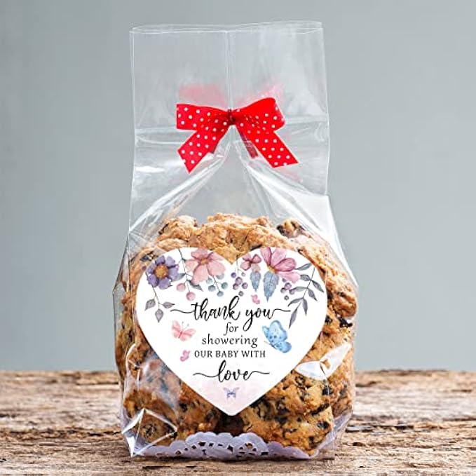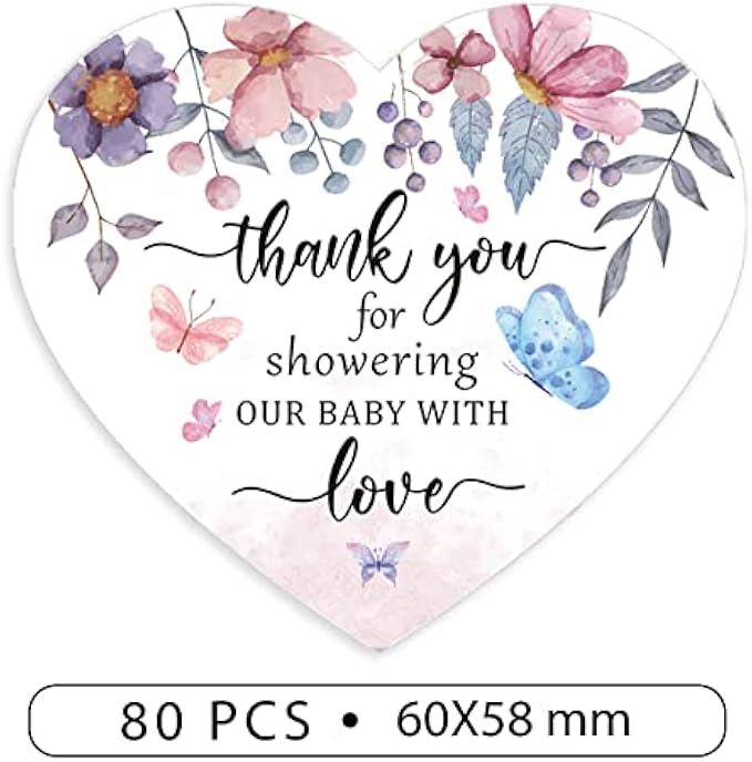 2.4 Inch Water Floral Love Shaped Thank You for Celebrating Stickers,Baby Shower Thank You Stickers,Butterfly Baby Shower Thank You Stickers for Kids Birthday Party Favor Label Decorations(80 PCS)