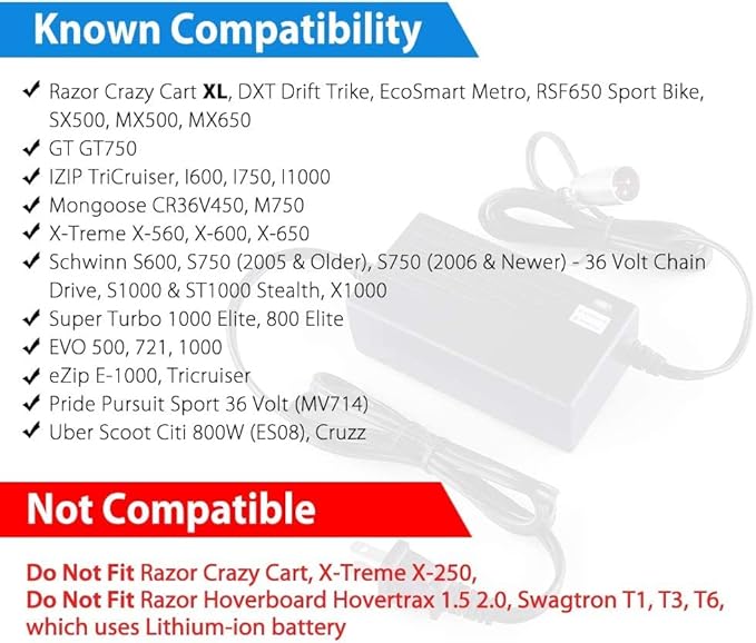 36V 1.5A Battery Charger for Razor - Premium 36V 1500mA Scooter Charger for Razor MX500, MX650, Razor Crazy Cart XL, Schwinn S600, ST1000, Stealth S1000, GT750, IZIP I750, I1000, M750, X-Treme X-600 - Razor Part W15128190014 - Qili QL-09005-B3601500H Fully Automatic Operation - Safely charges and maintains a full charge. The final stage of charging is the float mode and the battery may remain connected indefinitely. In this mode, the charger maintains fully charged condition. Plug N' Play Charger - Our 36v battery charger is an Automatic charger and simple to use. Red Light is ON when charging - Green Light is ON when fully charged. Please be Aware - 36V Sealed Lead Acid "SLA" batteries have on average a 1-2 year life span, sometimes longer. Generally, battery life will vary with use and needs to be replaced within 1-2 years. If our charger does not charge your battery, or your battery does not hold a charge, you will need to replace the battery. Universal Compatibility - Input AC 100 - 120V 50/60Hz, Output 36V 1.5A (1500mA), Short Circuit Protection, Reverse Polarity Protection, Built In 3-prong XLR connector (Male), 6 foot cord. Advanced Charging You Can Count On - Our 36v charger is reliable, compact, will fit in your pocket, and will rapidly charge your 36V battery in just a few hours. Quick Charging Scooter and E-Bike Accessories. Charging with an XLR Connector - This 36V charger typically is used with many scooters, electric bicycles, mobility scooters, and power chairs equipped with an off-board charging female XLR socket (or built in xlr receptacle). The charger features an automatic shut off when battery charging is complete. Charging time may vary with level of battery depletion.