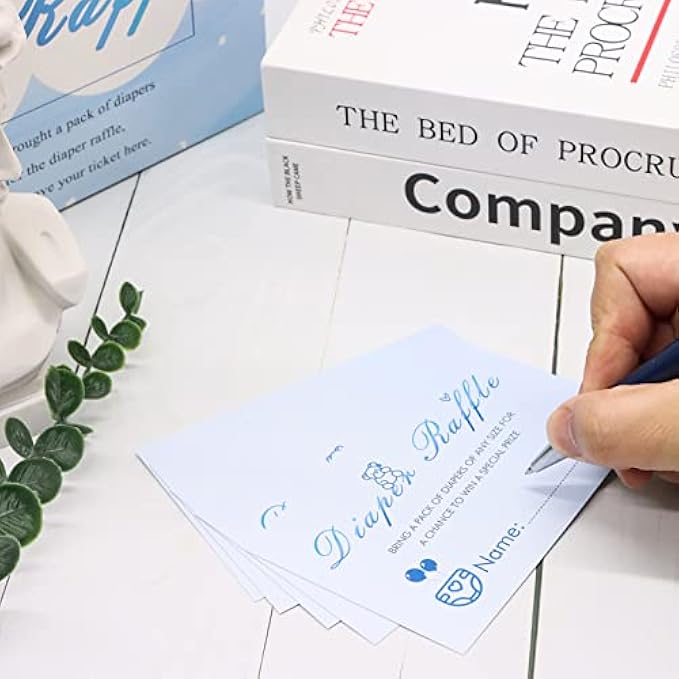 WHAT YOU CAN GET: You will receive a blue color diaper raffle box and 50 pcs raffle tickets for the baby shower game. Box size: 7.48 x 7.48 x 7.48 inches, and ticket size: 4.72 x 3.15 inches.