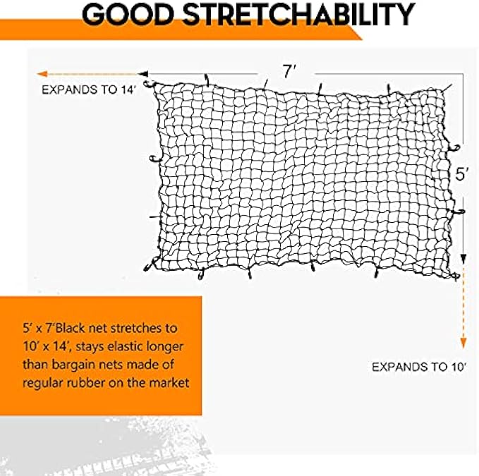 【IDEAL FOR SMALL & Large CARGO ITEMS】90" x 60"(7'x5') Black Bungee Cargo Net stretches to 180" x 120"(14'x10'). It's a very stretchy cargo net to keep your small and large items in conjunction with bungees.Ideal for securing multiple boxes bags and personal belongings for Roof Racks, SUVs, Truck Beds, Trailers, RVs, or wherever you need to hold down a lot of cargo.