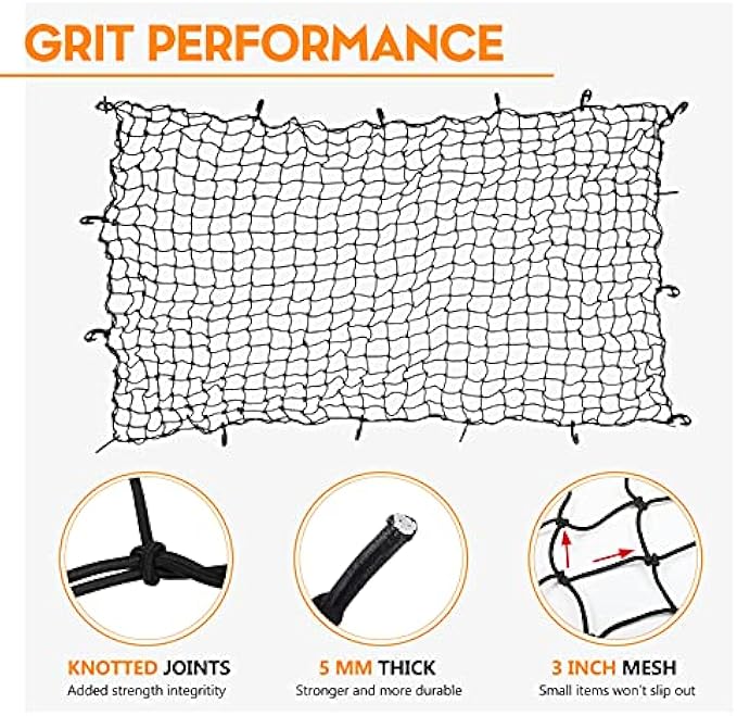 【UPGRADE BUNGEE CARGO NET】Made of latex bungee material,stays elastic longer than bargain nets made of regular rubber on the market.Crafted with extra thick 5mm bungee webbing is for maximum durability and longevity.Our premium net will safely secure your cargo and help eliminate ""fall through""!