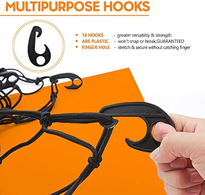 【MULTI-PURPOSE VERSATILITY】16 adjustable ABS plastic hooks with convenient holes for ease of stretching or attaching carabiner clips. Quickly strap down light loads by simply moving hooks from 1 mesh square to another.Perfect solution for ATV/UTV/SUV, Jeep Van roof top luggage rack, cargo carriers, cargo hitch racks, and boat. Ideal for truck bed loads for camping, carrying and dump runs (Note: pls check for the mesh size before purchasing)
