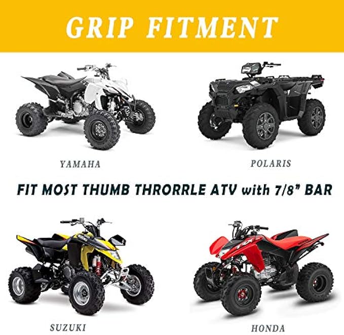 ?FITMENT:Designed specifically for ATV applications.This ATV handlebar grip fits most THUMB THRORRLE ATV with 7/8” bar.Both grips are 7/8''(22mm) diameter for use with a thumb throttle