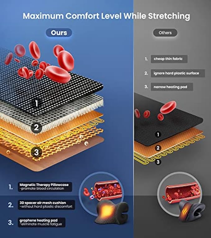 THE BEST INVESTMENT FOR YOUR NECK & HEALTH! Suffering from neck pain, neck stiffness or tension headache after prolonged sitting or looking down? Let Gadole heated neck traction device be your salvation! Neck and shoulder relaxers naturally stretch your neck to correct cervical curvature and relax muscle spasms. Unlike other neck massagers with heat, our hot therapy, magnetic therapy pillowcase and two traction levels, further enhance the comfort and effectiveness in relieving pain and tension.