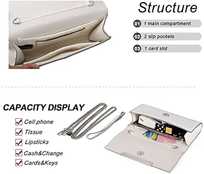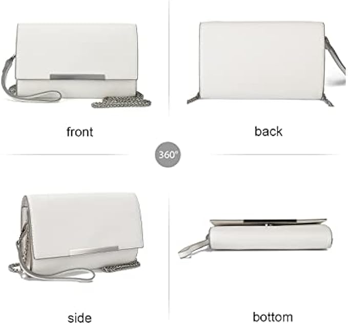 • White Clutch Purses for Women: 8.0" L x 5.0" H x 1.5" D, 0.6LB. Detachable chain strap with 23” drop.