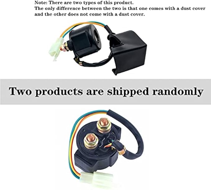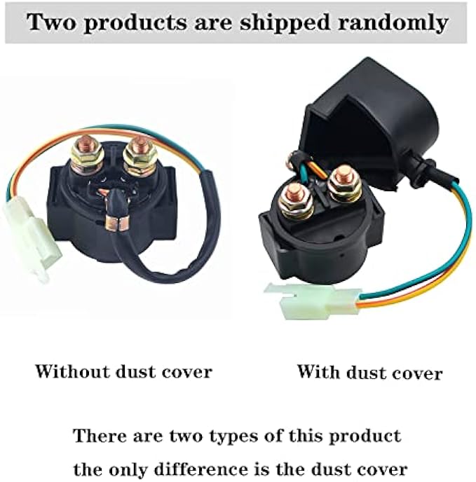 Compatible with: 4-Stroke GY6 Engine 50cc 70cc 90cc 110cc 125cc 150cc 200cc 250cc ATV Dirt Bikes Scooters Go Kart Dne Buggys Quad 4 Wheelers Pit Bike Moped Roketa SSR Taotao Sunl Coolster Replace Oem Code: 35850-286-007,35850-286-027,35850-286-017,35850-375-000;Polaris Sawtooth 200 QUAD 2006-2007, Polaris Ranger RZR 170 2009-2010, Polaris Phoenix 200 2005-2010, Polaris Sawtooth 200 QUAD 2006-2007, Polaris Phoenix 200 2005-2010, Yamaha RAPTOR 90 YFM90 2009-2013; ARCTIC CAT 150 UTILITY 2x4 AUTOMATIC 2009-2010, ARCTIC CAT 250 DVX 2006-2008, ARCTIC CAT 250 UTILITY 2006-2008, ARCTIC CAT 250 UTILITY 2X4 AUTOMATIC 2009, ARCTIC CAT 300 2009-2010 Compatible with: Starter Solenoid Relay for Honda Clones 50cc, 70cc, 110cc, 125cc, 250cc etc. Also may fit brand with paretta 125 cc GY6 engine: Roketa, Sunl, Baja, Kazuma, Coolster, Taotao, Peace Ice, Kazuma Carroll Stream Eagle, Panterra, Kymco, Redcat Tank Wildfire Xtreme Seaseng Qlink Yiben Jonway Jmstar, Vento Chinese 4-stroke 50cc-250cc ATVs, Dirt Bikes, Scooters, Go Karts Compatible with:Honda 50CC 70CC 90CC 110CC 125CC 250CC TRX400EX TRX400 TRX300 TRX300EX SporTrax TRX350 TRX250EX TRX250 Fourtrax Recon TRX250 ATC 125M 200 250 TRX450ES TRX450 TRX680 Rincon FL350R Pilot FL350 Odyssey FL400R Pilot VT1100C SHADOW TRX200 CH125 ELITE TRX500 GL1500 GL1800 GOLD WING CB300 CBF300; Kawasaki KZ750 KZ650CSR KZ550 KLT200 GSXR600 GSXR600Z GSXR750 GSXR1000; Can-am DS70 DS90 mini 4-Stroke DBOMBARDIER CAN-AM ATV DS250 Polaris Ranger RZR170 Phoenix 200 Sawtooth 200 Quad Quality Assurance!If you are not satisfied with our products,we accept all of the return,replacement or refund requests;Note: There are two types of this product. The only difference between the two is that one comes with a dust cover and the other does not come with a dust cover. Both products are shipped randomly.