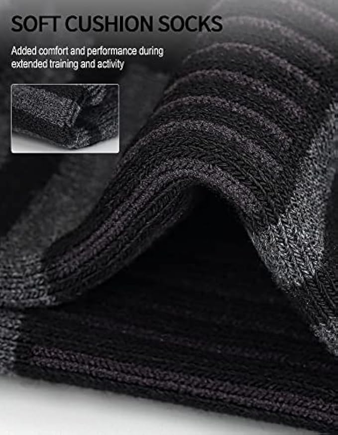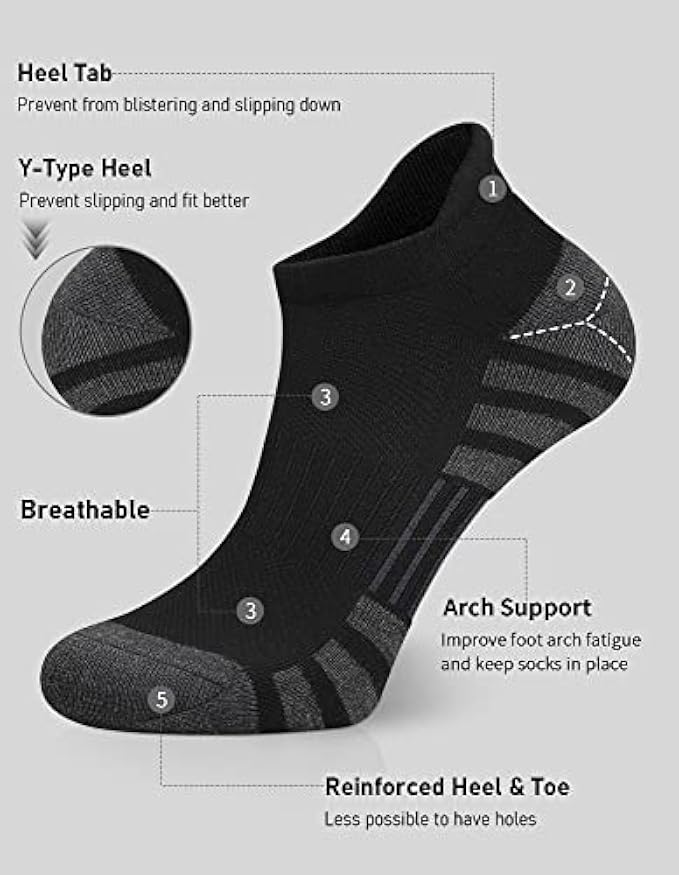 78% Polyester, 12.5% Spandex, 9.5% Rubber Imported Machine Wash Breathable - These running socks are made of high quality polyester, help quickly absorb moisture and release sweat, mesh ventilation in arch can release the heat and keep your feet dry all day. The sports socks are in great stretch and recovery. Our premium material provide our ankle socks comfortable and breathable to protect your skin of the feet. Friction & Shock Protection - Our ankle athletic socks use the seamless toe design, reducing the friction between toes and shoes to prevent blister. Cushion on the toe and in bottom with thicker yarn, reduces the impact of friction when your move for extra durability and comfort in high-wear areas, suitable to wear and anti-blister. Non Slip Off & Arch Support - Our low cut tab socks have suitable compression in arch to protect you when you walk, jog and run and increase stability for a perfect fit. Elastic cuff tab can lock the heel and make sure our sports socks non-slip in order to prevent athletic sock sliding from your daily walking, running, cycling, hiking, tennis, soccer. 3 Sizes To Choose - Our athletic cushioned socks provide 3 sizes in Black White Gray for options to meet your demands ,perfect for your feet. we have 3 sizes from M to XL for options to meet the demands of you as well as your family and your friends, Shoe Size 6-9/Sock Size 9-11, Shoe Size 9-12/Sock Size10-13 and Shoe Size 12-14/Sock Size 13-15. Best gift for women men her him, gift for family and friends. Socks for Men & Women - Airacker athletic sock designs for men or women who enjoy outdoor activities but want to keep their feet dry no matter what. Low cut design remain almost hidden inside in many shoes. Perfect high performance ankle socks for athletic, running, biking, jogging, strength training, hiking, power walking, playing football, gym exercise and golf. Best Customer Service - Every pair of trainer socks for women and men is hand-inspected by our dedicated quality inspection teams. you will 100% satisfied with our socks! If you have any problem in size, or if you have any quality problem, please contact us, we will send a replacement to you. All we do is aiming at making every customer have a good shopping experience!