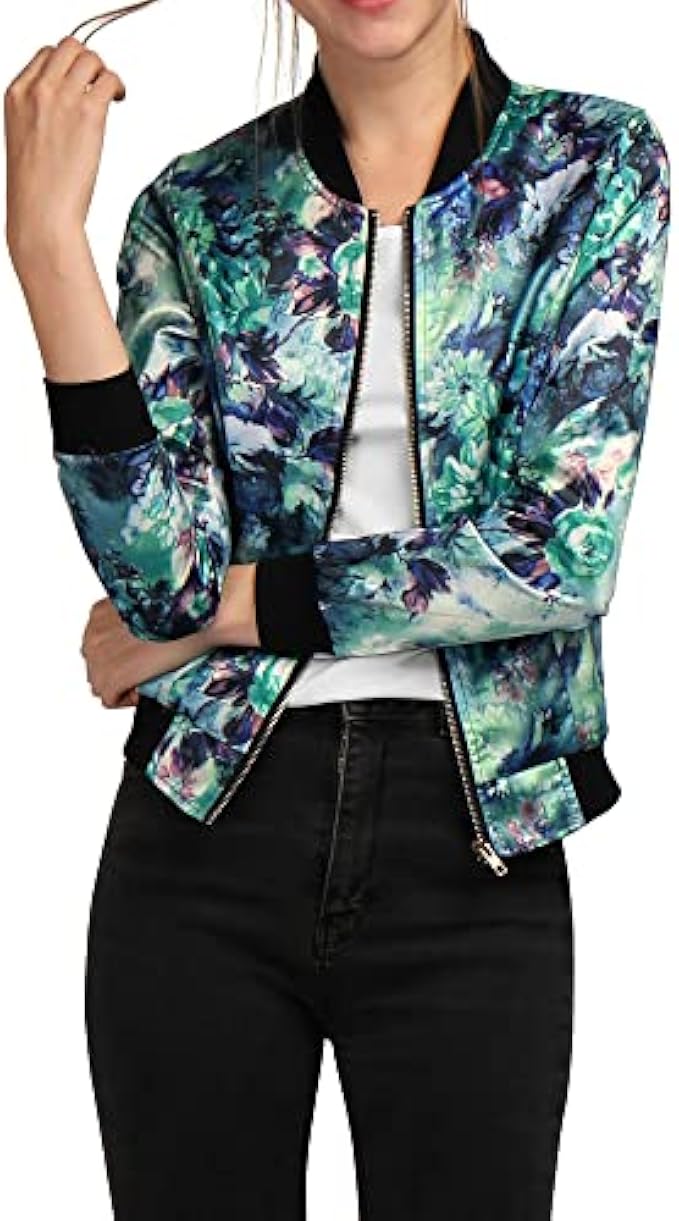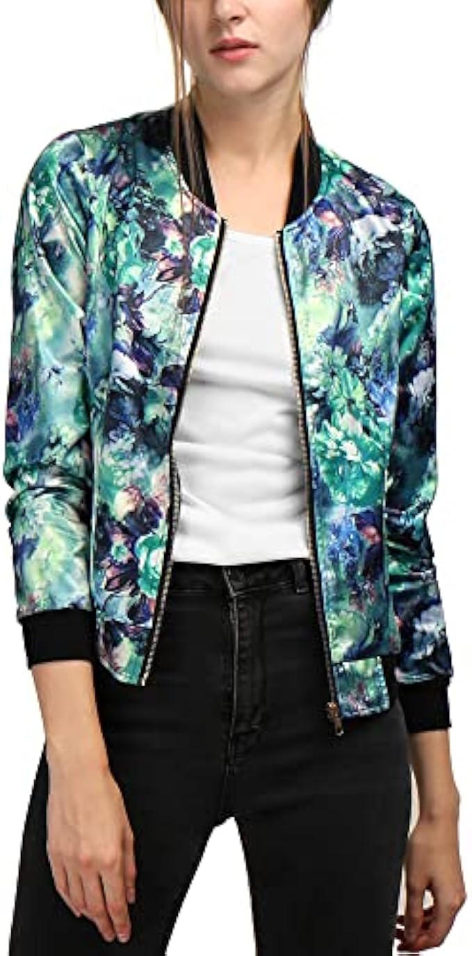 Allegra K 8127 Women's Stand Collar Zip Up Floral Print Bomber Jacket