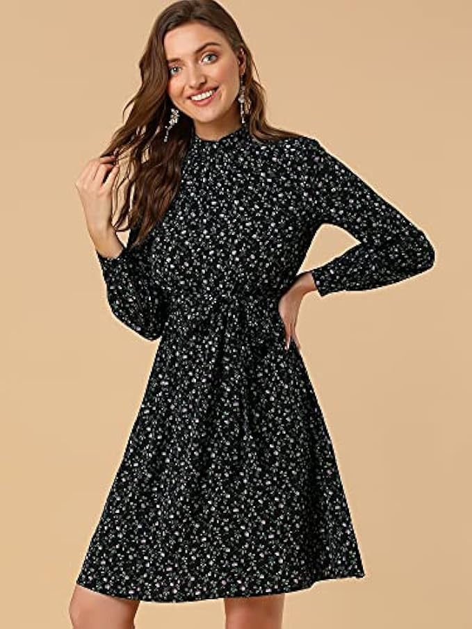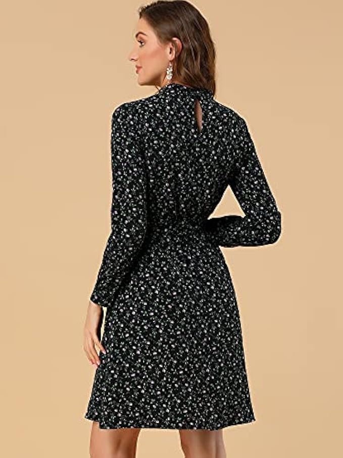 Allegra K Women's Mock Neck Swing Knee Length Long Sleeve A-line Floral Dress