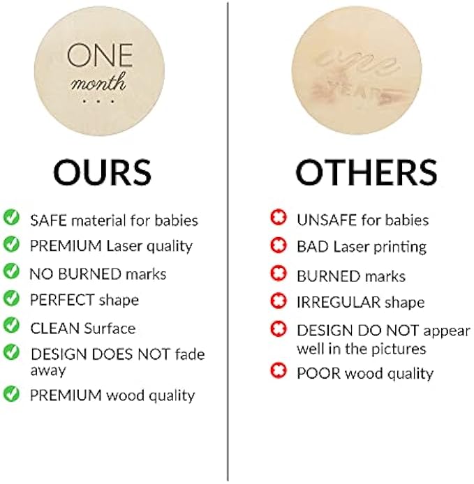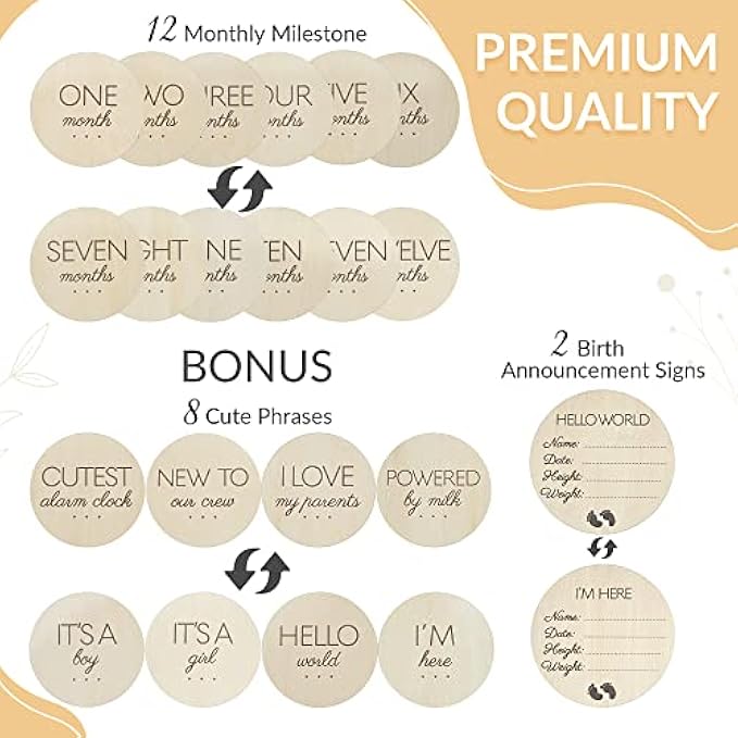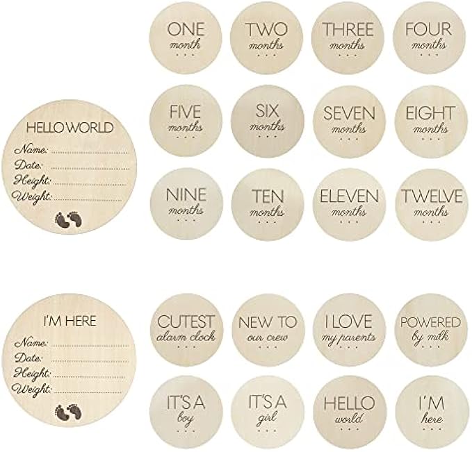 Premium quality: Our double sided baby milestone cards, newborn announcement sign and baby cute phrases discs (22 designs in total) are made of high-quality laser and wood, assuring the product durability and your baby safety.