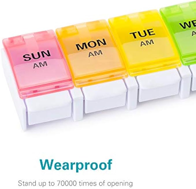 BOLD MARK & NO NEED TO REMEMBER: This AM PM pill organizer bold marks of the week clearly let you know what pills to take each day. The upgraded printing guarantees that the marks will last for up to 20,000 uses without wear and tear.