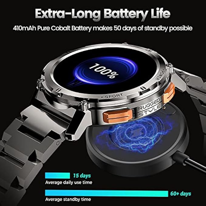 • ⌚60Day+ ultra-long life battery - AMAZTIM T2 is equipped with a 100% pure cobalt-based battery (military grade), the battery capacity is as high as 410mAh ensuring optimal performance and longevity which is twice as much as that of conventional smart watches. At the same time, super power-saving AI algorithm breaking the industry is adopted to minimize power consumption, enough to last up to 2 weeks under normal use, and can continue to use sports mode, health index measurement and other functions for up to 60+ days in power-saving mode. With a quick 10-minute charge, you can have enough battery backup to last for up to 3 days.