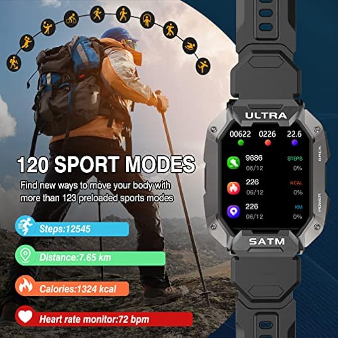 120 Modes Fitness Activity Watch - The Fitness smart Watch for man with the latest motion sensors supports 120 exercise modes such as walking, running, cycling, swimming and more. It will automatically and accurately record your exercise data to help you exercise scientifically. This military smartwatch also provides you with more useful functions such as weather forecast, alarm clock, music control, sedentary reminder and more.