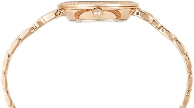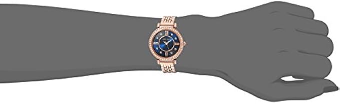 Bezel set with 52 clear premium crystals; mineral crystal lens; navy blue sunray dial with rose gold-tone hands and roman numerals; silver-tone glitter filled markers