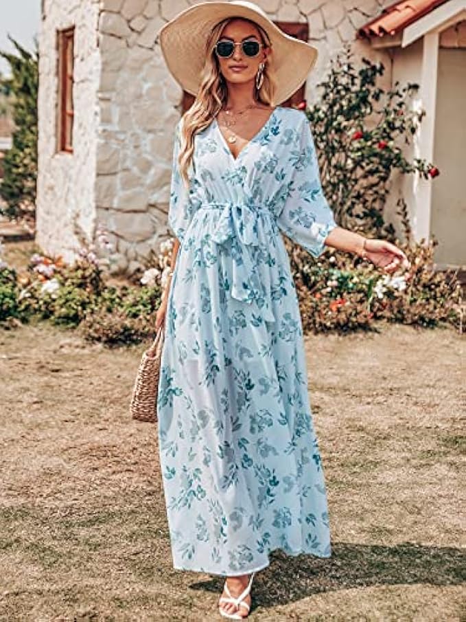 • Features - this kimono maxi dress features wrap v neck top,3/4 oversized sleeves,elastic waist with a belt,high slit to lined,maxi length,loose fit,floral printed.