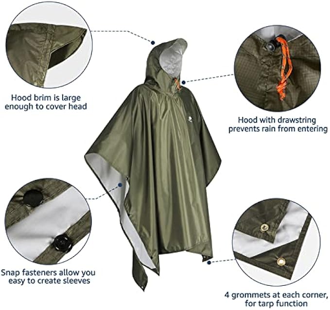 Multipurpose: The three in one multi-functional poncho can be used as floor mat, cape,a simple shelter and canopy. The poncho has eyelets on the hem for building a poncho shelter or a ground sheet, and hook & loop fasteners on the sides allowing you to use it as a sleeping bag cover.It can also provide a barrier against wind or serve as a makeshift shelter if needed.Perfect for the traveler, outdoor enthusiast, or for any outdoor activity with rain on the horizon.