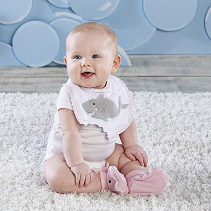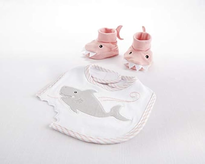 GIFT SET - Ocean-themed design, White bib with appliqued grey shark, embroidered accents, pink and White striped trim and cut-out shark bite; booties have appliqued eyes and felt teeth. Velcro closure