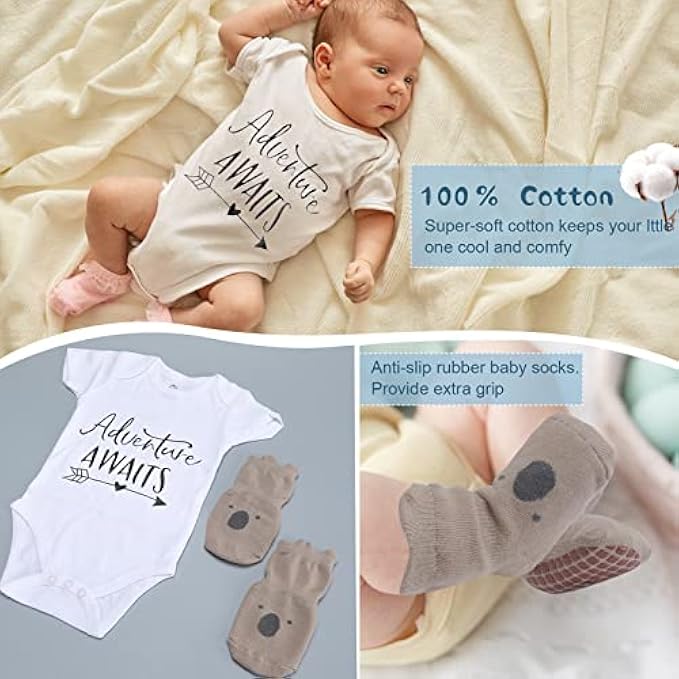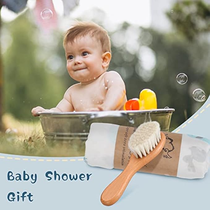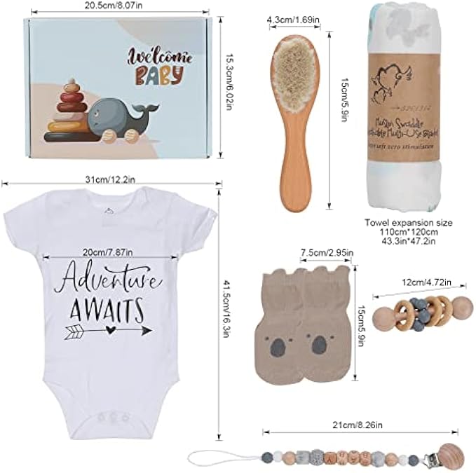 • ?【Baby Shower Gifts】? A soft wool brush for gently brushing baby's hair. The non-slip design of the baby socks helps babies learn to walk more confidently. Smooth, textured natural wood rattles are perfect for toddlers to grip and play with, and cute pacifier chains keep baby's pacifier by their side at all times.