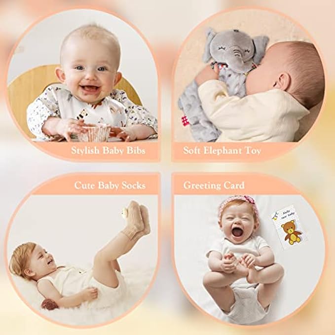 • ???Baby Gifts Basket Essentials – Everything comes in a cute square gift box. Items include wrap blanket, elephant toy, 2pcs baby rattle, baby keepsake footprint, decision coin, baby milestone, bibs, socks and greeting card to welcome the cute newborn.