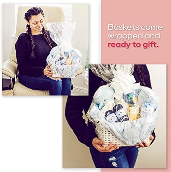Beautifully wrapped baby gift baskets for newborn boys and girls. Comes ready to be gifted with must haves essentials for babies. This makes a great baby shower present or welcome home gift.
