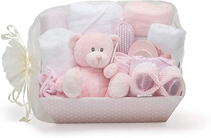 • Impressive Selection – Everything sits in an attractive pink heart decorated tray and wrapped in a chiffon drawstring bag. Items include a cute teddy bear, pink bodysuit, bib, hat, a pair of knitted booties and socks. A brush and comb set, blanket wrap, hooded towel, 2 muslin cloths super soft face cloth and a hanging oval plaque to welcome the gorgeous girl