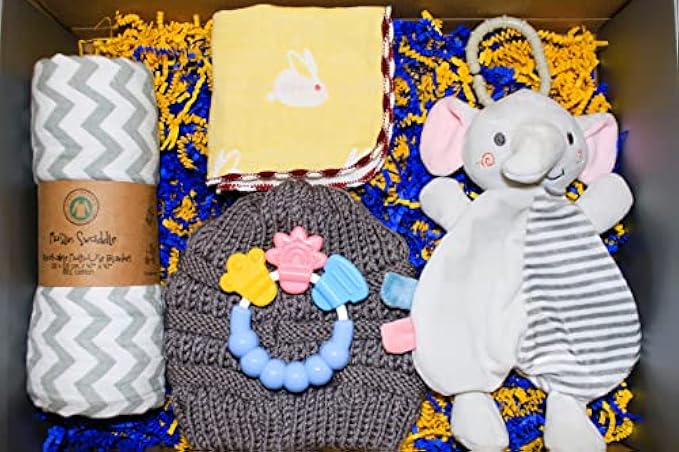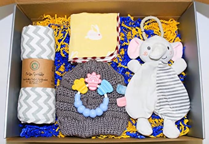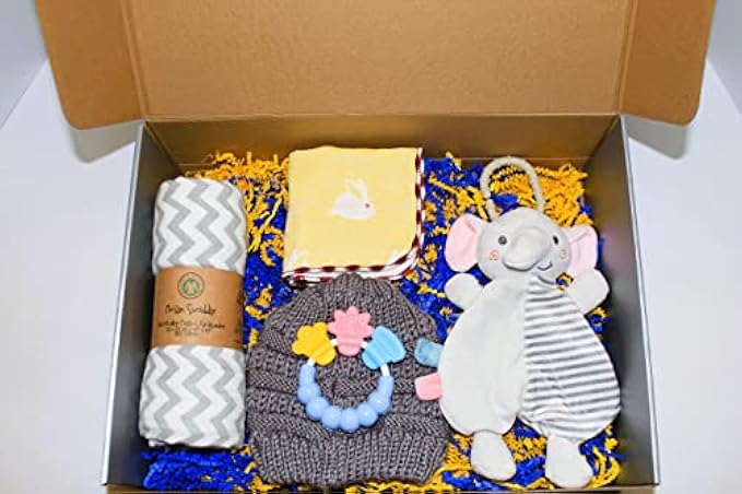 • 5 Gifts- Included in the box are: A bamboo Muslin swaddle blanket, an elephant, a soft and warm baby beanie, a 100% cotton burp rag and a baby rattle/teething ring.