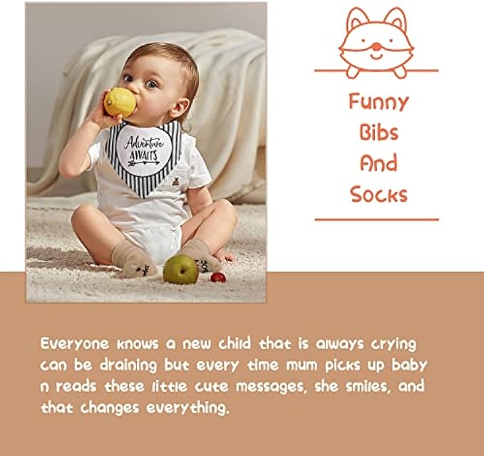 • ??【BABY GIFTS FOR GIRLS BOYS】Smooth and textured natural wood teething toys, no paint and burrs, smooth edge, perfect grasping toy for toddlers, also bite for teething relief. 100% cotton funny baby bibs are designed with fashionable printing, easy to match your baby's outfit, bring a smile to the face of everyone who sees this. And the baby socks (6-12 months) with grip offer non-slip, round-dotted grippers to children as they crawl, walk and run.