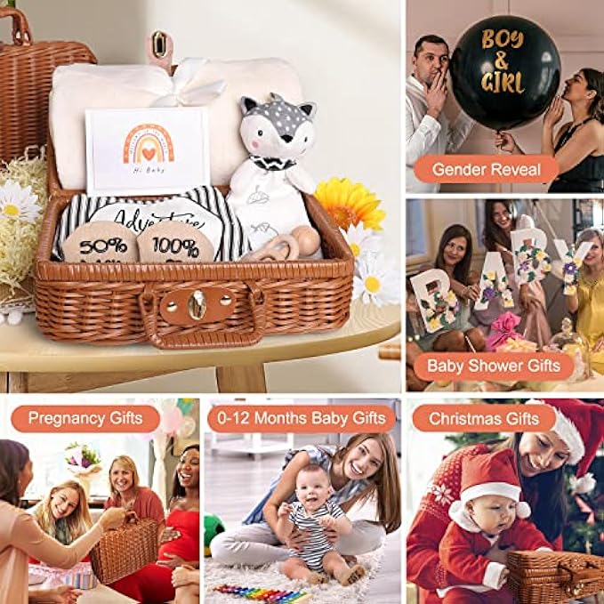 • ?✨【Unique Baby Gift Basket】A thoughtful baby shower gifts for new parents, includes 1 * Soft Baby Blanket, 1 * Fox Baby Security Blanket, 1 * Wooden Rattle Toy, 1 * Funny Baby Bibs and Socks, 1 * Hi Baby Greeting Card, 1 * Luxury Gifts Box. The first to use rattan suitcases as a carrier for baby gift sets, sure you won't be disappointed with the elegantly designed newborn gift sets.