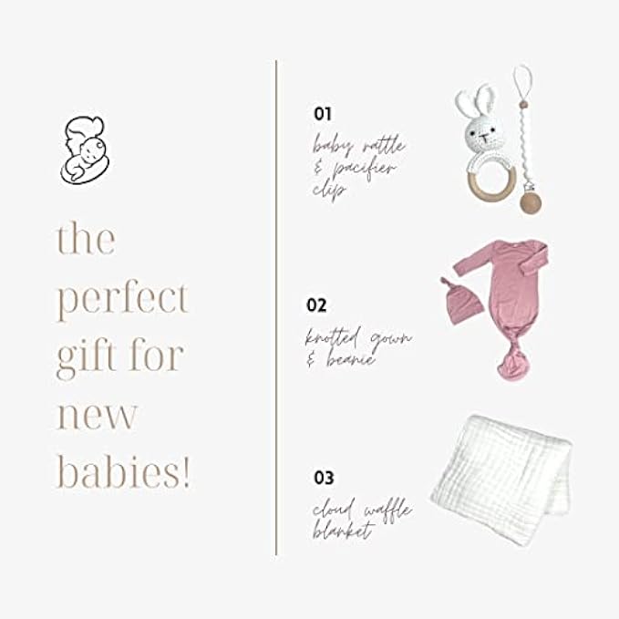 Baby Shower Keepsake Gift Basket Set Includes Cloud Waffle Blanket, Knotted Gown with Hat, Bunny Crochet Rattle and Silicone Pacifier Clip, Baby Girl Dusty Rose