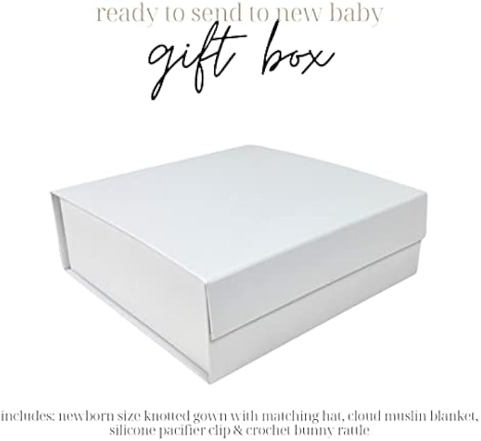 • 5 Piece Gift Set - This beautiful newborn baby gift comes with everything you need to ensure new parents feel loved. Premium packaging includes a white gift box with magnetic closure is sturdy so your gift will show up nicely packaged and well received. Package includes oversized muslin waffle baby blanket, blue knotted baby gown with matching beanie, silicone beaded pacifier clip and hand-knitted crochet bunny rattle