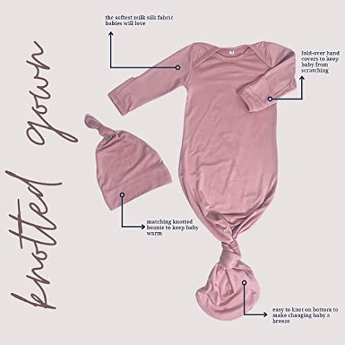• Knotted Newborn Gown - New babies love soft fabrics and this knotted gown is sure to impress. Made of a milk silk fabric it is extra soft to the touch. The extra fabric at the bottom makes it so easy to tie in a knot and untie for quick and easy diaper changes. The sleeves include added cuffs to cover baby hands to help prevent scratching and the knotted beanie will help keep their sweet little heads warm.