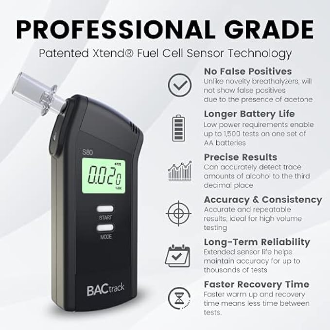 PROFESSIONAL-GRADE ACCURACY - Powered by BACtrack's largest platinum-based Xtend Fuel Cell Sensor, the S80 utilizes the same pro-grade technology trusted by hospitals, clinics, and even law enforcement.
