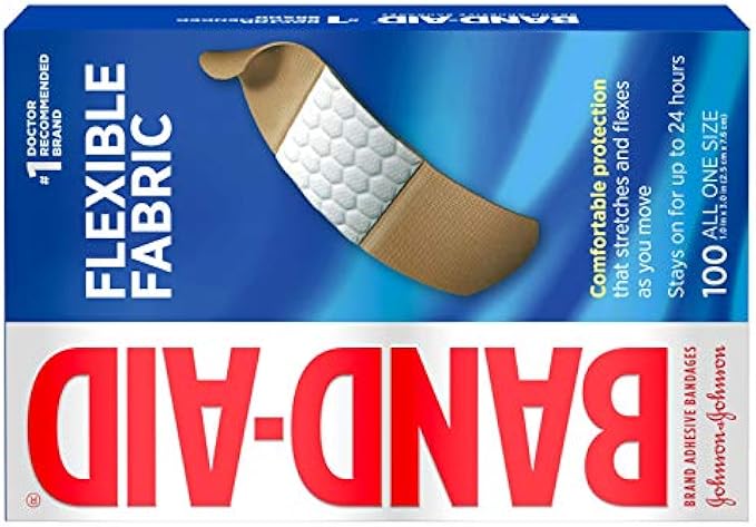 100-count Band-Aid Brand Sterile Flexible Fabric Adhesive Bandages for first aid and wound care protection of minor wounds, cuts, scrapes and burns. Adhesive bandages make a great addition to wound care supplies and first aid kits