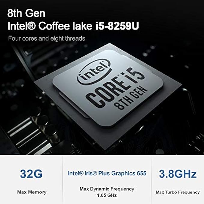 • √【Intel Coffee Lake i5-8259U Processor】 Beelink SEi8 equipped with 8th generation Ultra High-efficiency Intel Coffee Lake i5-8259U Processor (four cores and eight threads,2.3GHz,Max Turbo Frequency 3.8GHz,supports 6MB Smart Cache),faster and more advanced. Intel i5- 8259U runs faster than i5-5257,i3-1005G1,i3-10110, i3-5005, j4205, etc chips,for your visual home entertainment,streaming video,web browsing,work and games create a very smooth experience. Say goodbye to system freezing and buffering.