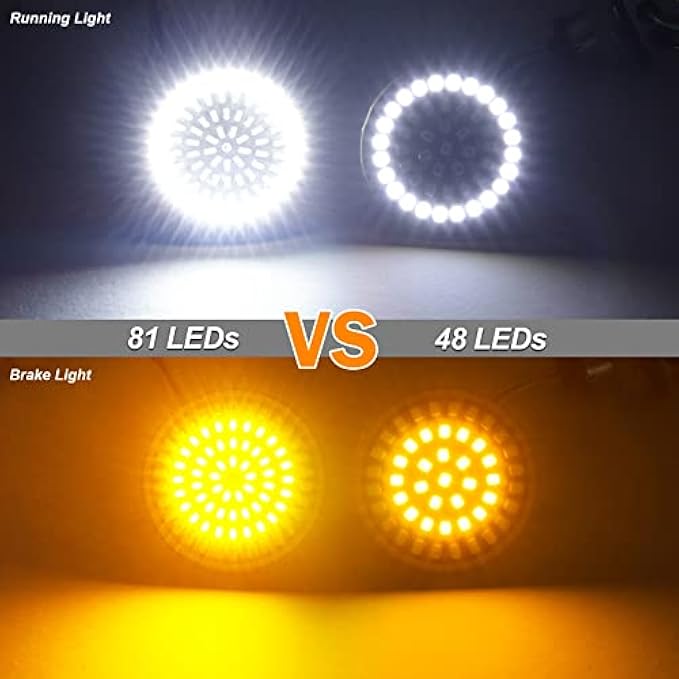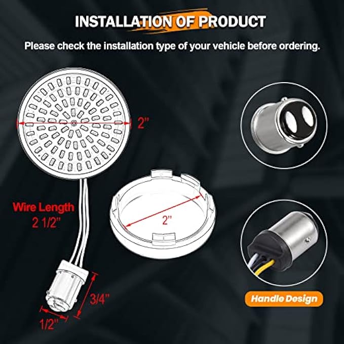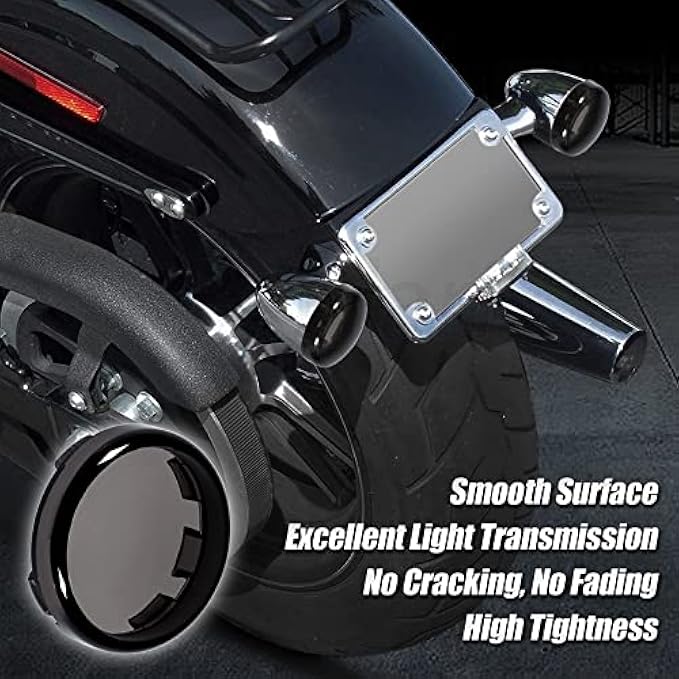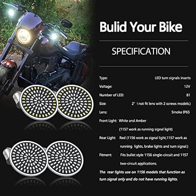 Compatibility:【Bullet LED turn signals】It is LED turn signals compatible for Harley with 2" bullet style models. ➵For Touring : Street Glide,Street Glide Special ,Road Glide ,Road Glide Special,Road King Special(Excluding CVO/Limited/Classic/Ultra) .➵For Sportster :Iron883, iron 1200, SuperLow 72 48,883R 1200T,1200 Low ect. ➵For Dyna : Wide Glide, Street Bob, Low Rider , Fat Bob ect.➵For Softail :Sport Glide,Slim, Low Rider, Fat Boy, Fat Bob,Fat Boy S,Low rider S ect. Note:【Not Fit 3 1/4“ 】Some models may be need load resistor decoders or flasher relay to ensure the LED turn signals light up with full power and prevent 1157 LED bulbs from being hyper flashing, warning or any malfunction error code on dashboard. Light Performance:【Switchback Design Lighting , 81 LEDS, Extremely Bright】300% brighter than halogen bulbs.Front 1157 blinker available in two color, white for running light, amber for turn signals.Rear signal lights available in red, out ring for running light,all for brake light.This LED turn signals allows you to be more noticeable.it have a long life and fit the motorcycle system perfectly. Smoke Lenses:【Smooth and Excellent Light Transmission】Made of high-quality PC plastic, the signal lights lens cover can protect the turn signal light inside from being damaged by dust, dirt and other factors.Maintaining clear visibility without weakening the turn signals. Light Installation:【Plug-and-play and Integrated handle design】The LED turn signals are plug-and-play on models with front and rear bullet style housings. Package Contains:【12 Months Warranty】1 Pair of front 1157 LED turn signals.1 Pair of rear LED turn signals.2 Pair of smoke turn light lenses. All LED turn signals will be tested before they are sent out, but they may be damaged during shipping. If you have any problems, please contact the seller and we will try our best to handle it for you.Please check the compatibility of description before ordering.