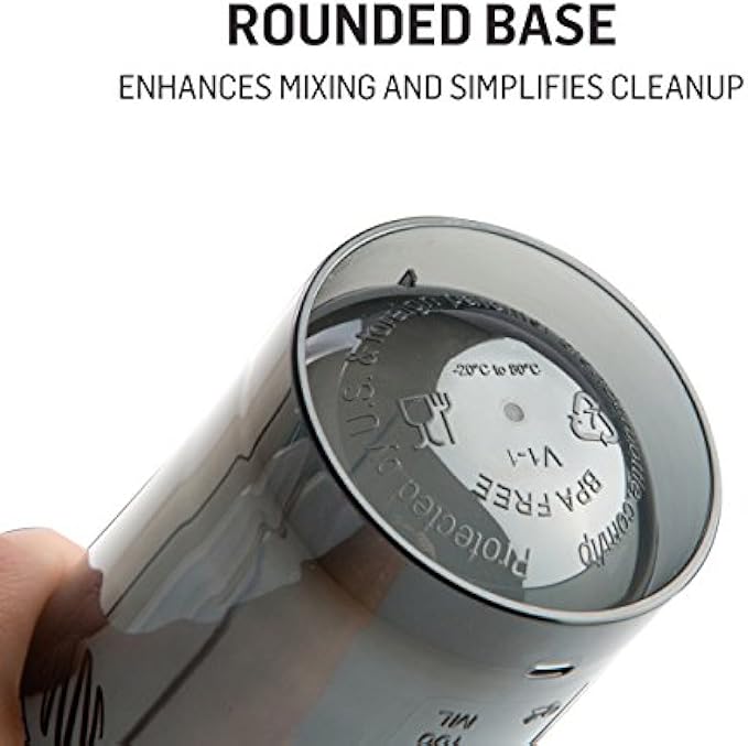 Wide mouth makes it easy to add mix scoops and liquids, and embossed markings measure both ounces and milliliters; rounded base for thorough mixing