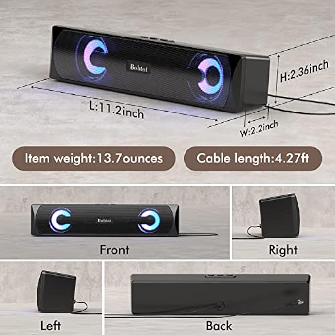 Bobtot Computer Speakers Bluetooth Desktop Soundbar - HiFi Stereo Audio RGB Gaming Mini Subwoofer Wired USB Power Desk Monitor Laptop PC External Speaker USB Speakers Multimedia Sound Bar for Phones