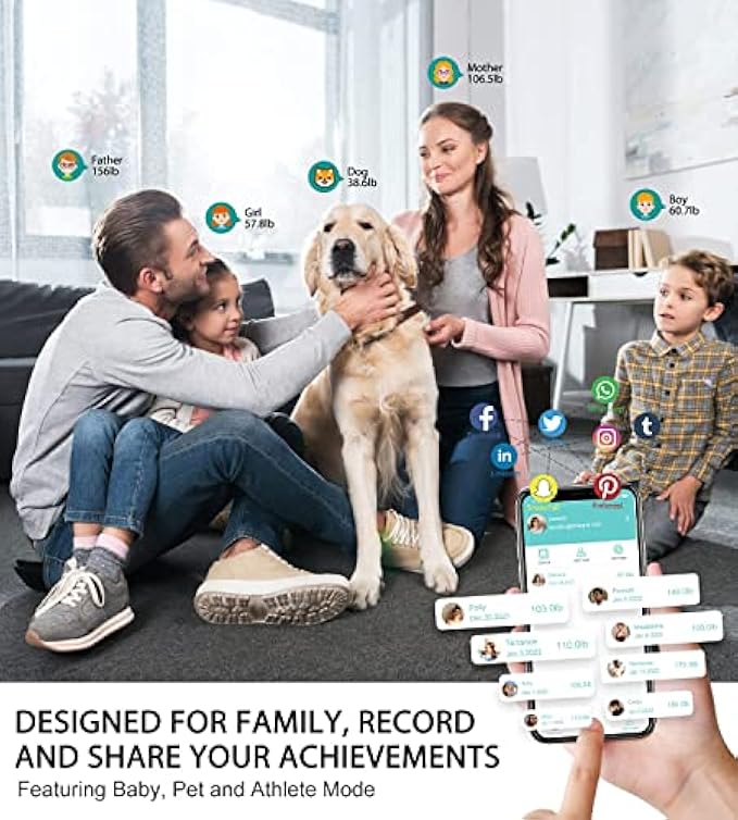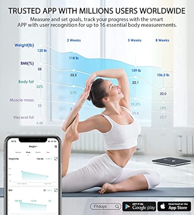 16 Essential Body Composition Analysis: Weight scale utilizes BIA to measure 16 body metrics include body weight, heart rate, BMI, muscle rate, body fat, subcutaneous fat, visceral fat, fat-free body weight, body water rate, skeletal muscle rate, muscle mass, bone mass, protein, BMR, heart index, body age. The data stored in the app help to know your body condition comprehensively. In addition, you can weigh yourself anytime without phone, the data will sync to the app once it’s connected again. Extra Large Display & Rechargeable: Different from other bathroom scales that only display weight, the large colorful VA display screen shows your 8 key measurements, including weight, body fat%, BMI, water%, muscle mass, heart rate, bone mass and body type, help you get a clear view of your essential body metrics at a glance. This smart scale is rechargeable via Type-C cable(included in package carton tube). Durable built-in lithium battery can be used for a many years very budget friendly. Syncs with Fitdays APP & Fitness APPs: Download "Fitdays" app via Apple Store or Google Play. The weight scale syncs the data onto your smartphone automatically via Bluetooth 4.0 BLE. The app provides detailed charts and trends of 16 body composition metrics over days, weeks, months or even years. It can also syncs data to fitness APPs like Fitbits, Google Fit, APPLE Health, Samsung Health, which means you can track & manage your health or share your achievements with friends anytime, anywhere. High Accurate Digital Body Fat Scale: Compare with other weight scales with 4 electrode areas, ABLEGRID smart weight scale adopts advanced ITO tech provides full-surface sensor area for all size feet. Equipped with 4 Auto-calibrating G-shaped sensors & advanced BIA technology can ensure the most accurate measurements of your body composition. The measurement result is accurate to 0.1lb/0.05kg and maximum weight capacity reaches to 396lb capacity. One button to switch the weight unit (lb, kg, st) Multiple User Profiles: The "Fitdays" APP allows for unlimited user accounts, each holding up to 24 member profiles. It’s smart enough to automatically recognize who steps on, each user will receive the data on their own devices conveniently, which allows for seamless tracking of your family’s health. Use guest mode for a non-recorded check-in or baby mode to track your baby or pet's weight growth conveniently, the athlete mode provides more accurate measurements for professional athletes.