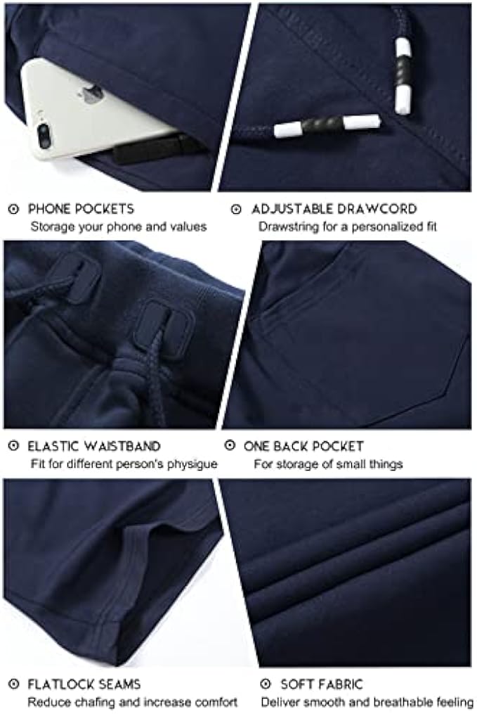 70% Cotton, 25% Polyester, 5% Spandex Imported Drawstring closure Hand Wash Only SHORTS MEN FIT SIZE - S (Weight: 105-125 lb), M (Weight: 125-145 lb), L (Weight: 145-165 lb), XL ( Weight:165-185 lb), 2XL (Weight: 185-205 lb), 3XL (Weight: 205-225 lb) ----These mens workout running pants are US size, If you prefer loose fit, go up a size. COMFORT FABRIC - Casual shorts for men are made with 70% Cotton, 25% Polyester, 5% Elastane. Lightweight,comfort and breathable soft cotton fabric will bring you the best wear experience. ZIPPER SIDE POCKETS & BACK POCKET - Men's shorts have 2 side zipper pockets, 1 back pocket. The front pockets are large enough to hold a newest iPhone allow for quick and easy access. and the back pocket can store some content, but this pocket not with the zipper, please do not store valuables. ELASTIC WAISTBAND & DRAWCORD - Mens 2 pack running shorts are fitted with an elastic can perfect suit your waist. Drawcord ensures a comfortable fit and keeps shorts from sliding down. PERFECT FOR OUTDOOR & INDOOR ACTIVITIES - Comfortable gym shorts perfect for lounge around the house, walking the dog for a walk, casual hangouts or sleeping. Other then that mens workout shorts fit great for jogging, gym workout, running, biking, weightlifting, mountain climbing, basketball, hiking, fishing casual, party or fashion occasions.