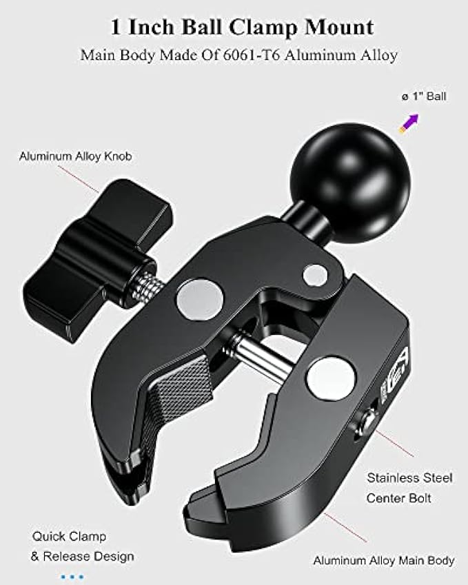 ▶ Main body made of 6061-T6 aluminum alloy for durability and reliability in the most demanding environments. CNC integral molding, solid structure. Anodized surface treatment, smooth surface, durable. TPU over-molded ball head, non-slip and wear-resistant. Aluminum alloy tough-claw with built-in TPU provide stable gripping and protection of mounting surface.