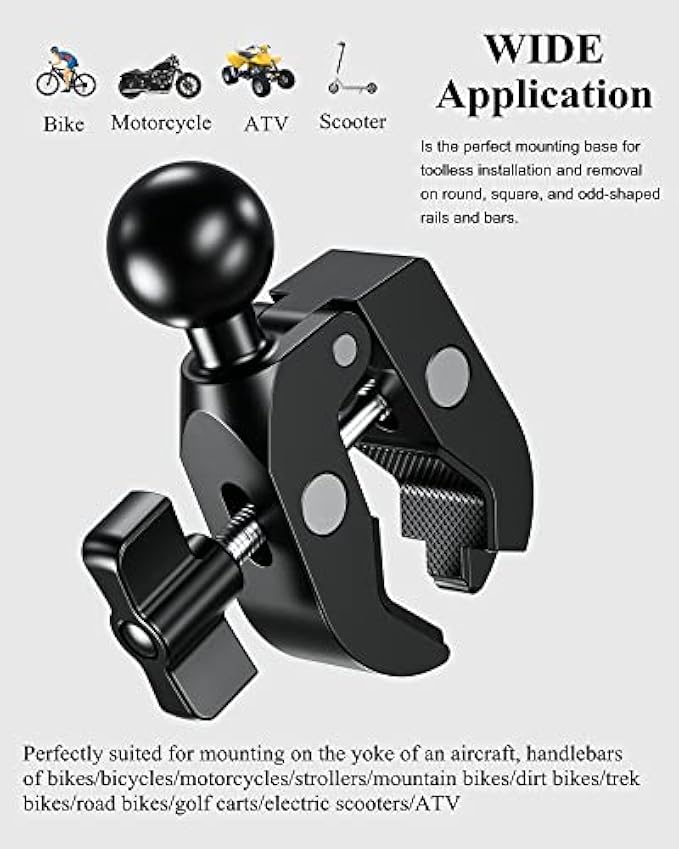 ▶ Perfectly suited for mounting on the yoke of an aircraft, handlebars of bikes/bicycles/motorcycles/strollers/mountain bikes/dirt bikes/trek bikes/road bikes/golf carts/electric scooters/ATV, or even on kayak rails and roll bars. Ideal mounting base for phones, tablets, action cameras, rod holders, and much more.