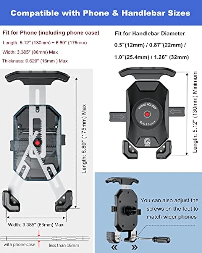 [ Compatible with Phone & Handlebar Sizes ] This Motorcycle Phone Mount Holds Phones (Case Included) Dimensions: Length 5.12'' (130mm) ~ 6.89'' (175mm), Width 3.385'' (86mm) Max, Thickness 0.629'' (16mm ) Max. Compatible Handlebar Diameter: 0.5''(12mm) / 0.87''(22mm) / 1.0''(25.4mm) / 1.26'' (32mm). Suitable for installation on bike, bicycle, motorcycle, stroller, mountain bike, dirt bike, trek bike, road bike, golf cart, electric scooter, ATV, etc.