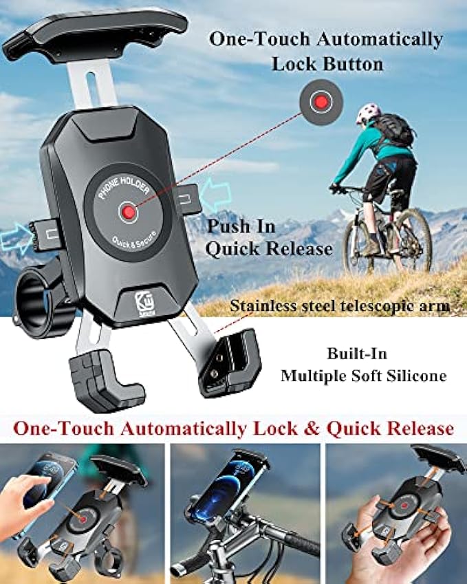 [ Sturdy and Safe ] A special shape design of this bike phone mount can be wrapping four corners of your cell phone tightly. Adopts stainless steel telescopic arms and aluminum alloy handlebar mounting base, super sturdy! The bike phone holder holds your phone perfectly even riding on a bumpy road.